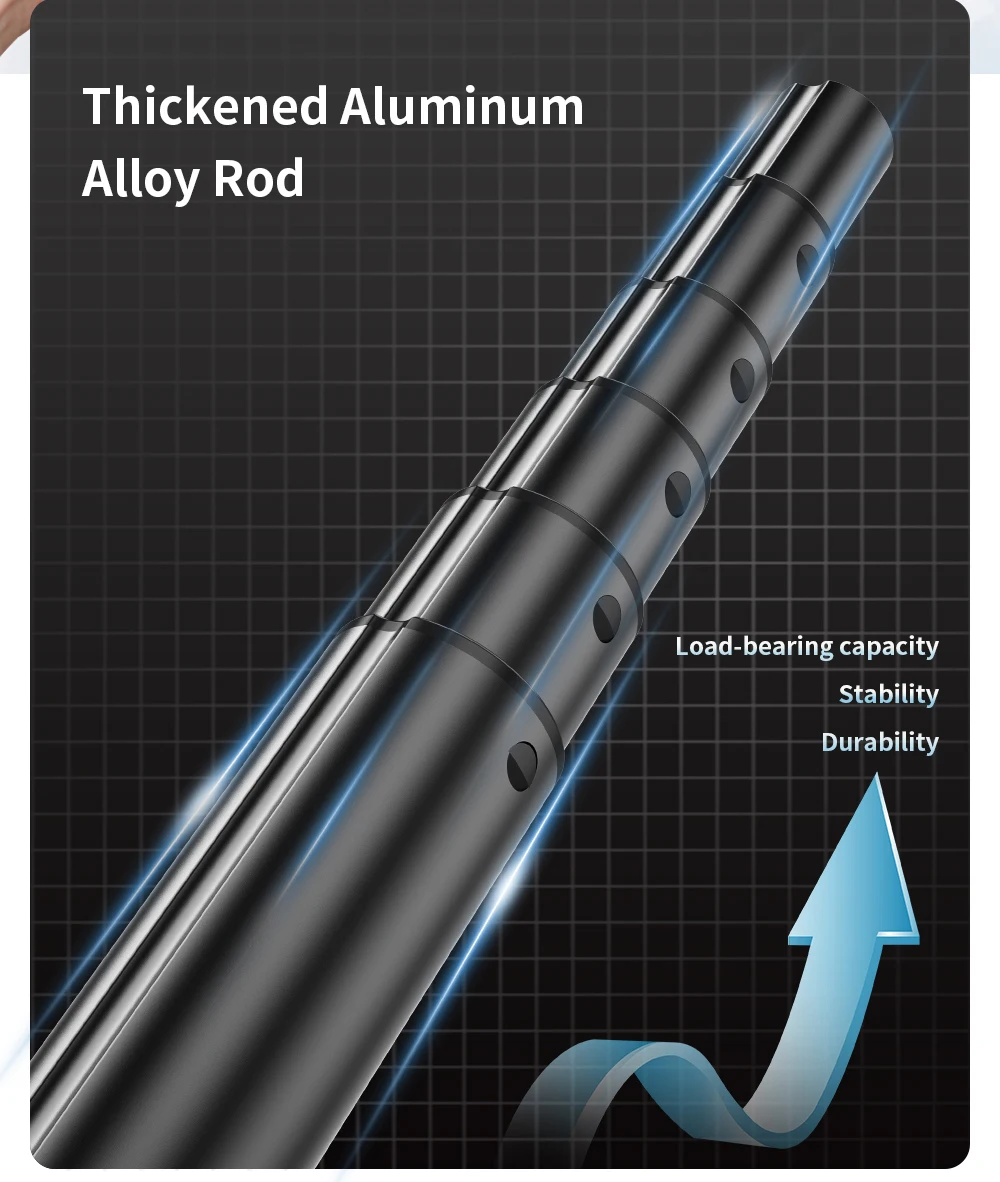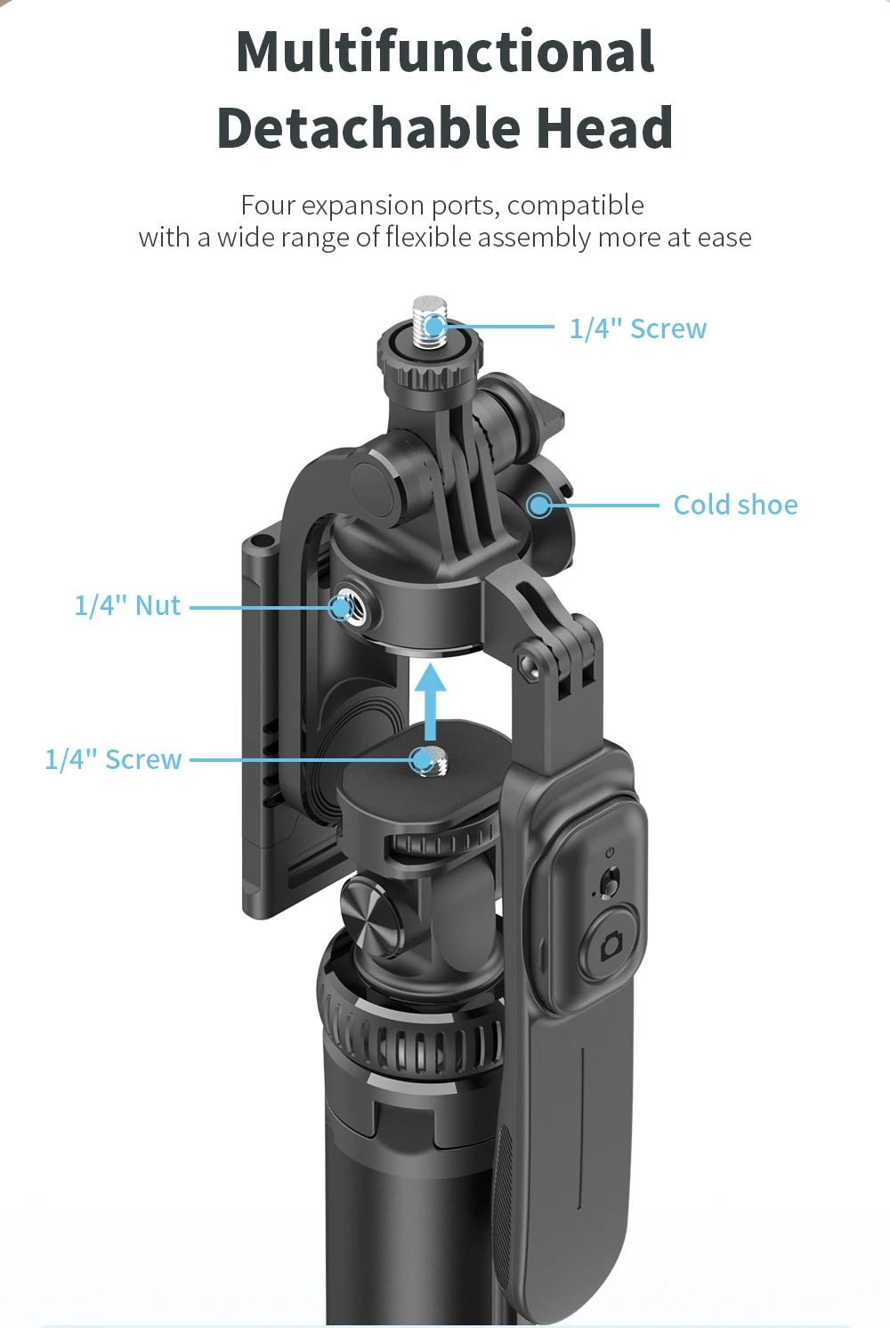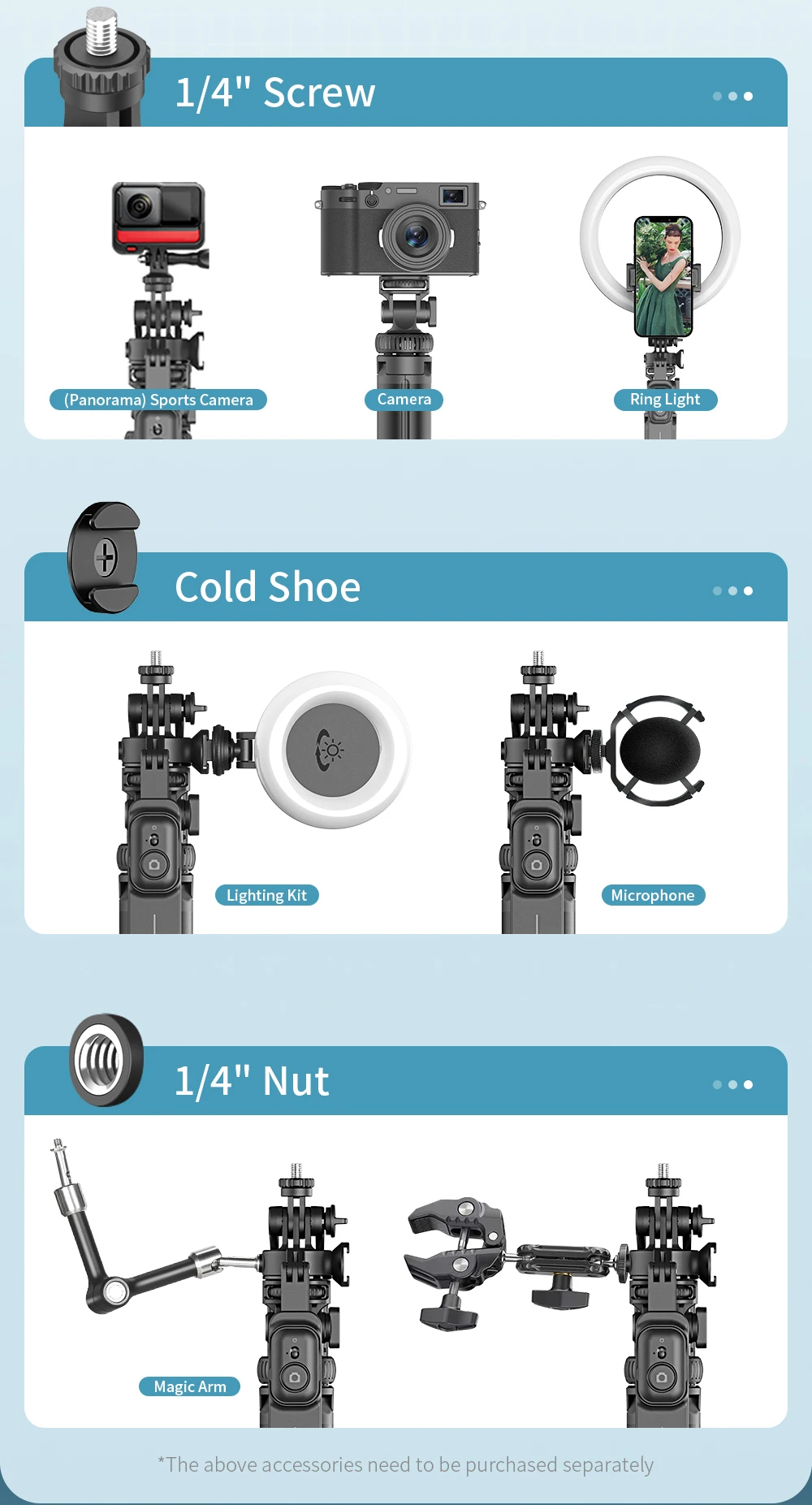 >> with 1/4" Bolt head for mounting multiple necessary photography devices, such as ring light, fill light, and even digital camera and action camera.